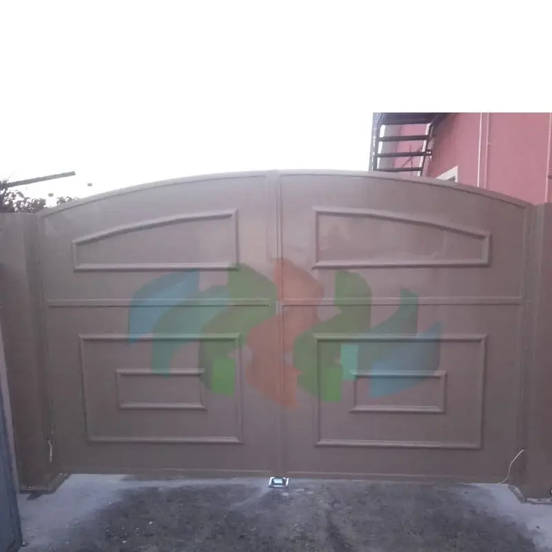 Portão de duas folhas em chapa lisa e adornos em alumínio
